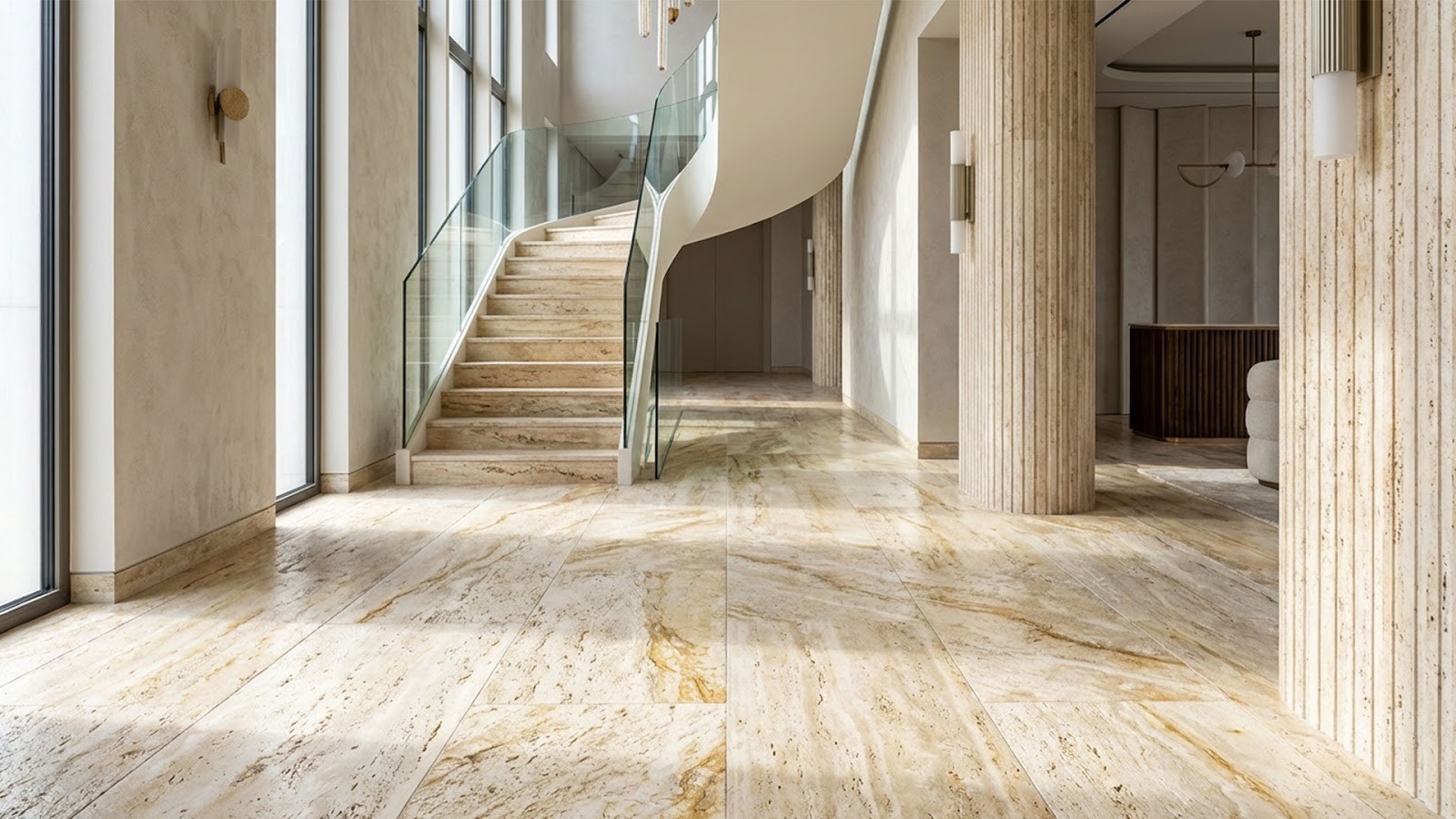 - سنگ تراورتن: شاید با شنیدن سنگ تراورتن فکر کنی این سنگ فقط برای نما کاربرد داره؛ اما میتونه سنگ مناسب کف راهرو هم باشه. این سنگ سطح نیمه ماتی داره که کمتر لیز میشه، مقاومه و طرحها و رنگهای متنوع داره.